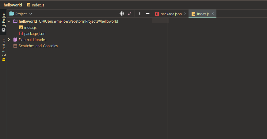 프로젝트 하위 항목으로 index.js가 추가되고 index.js의 편집화면이 뜨는게 보인다.