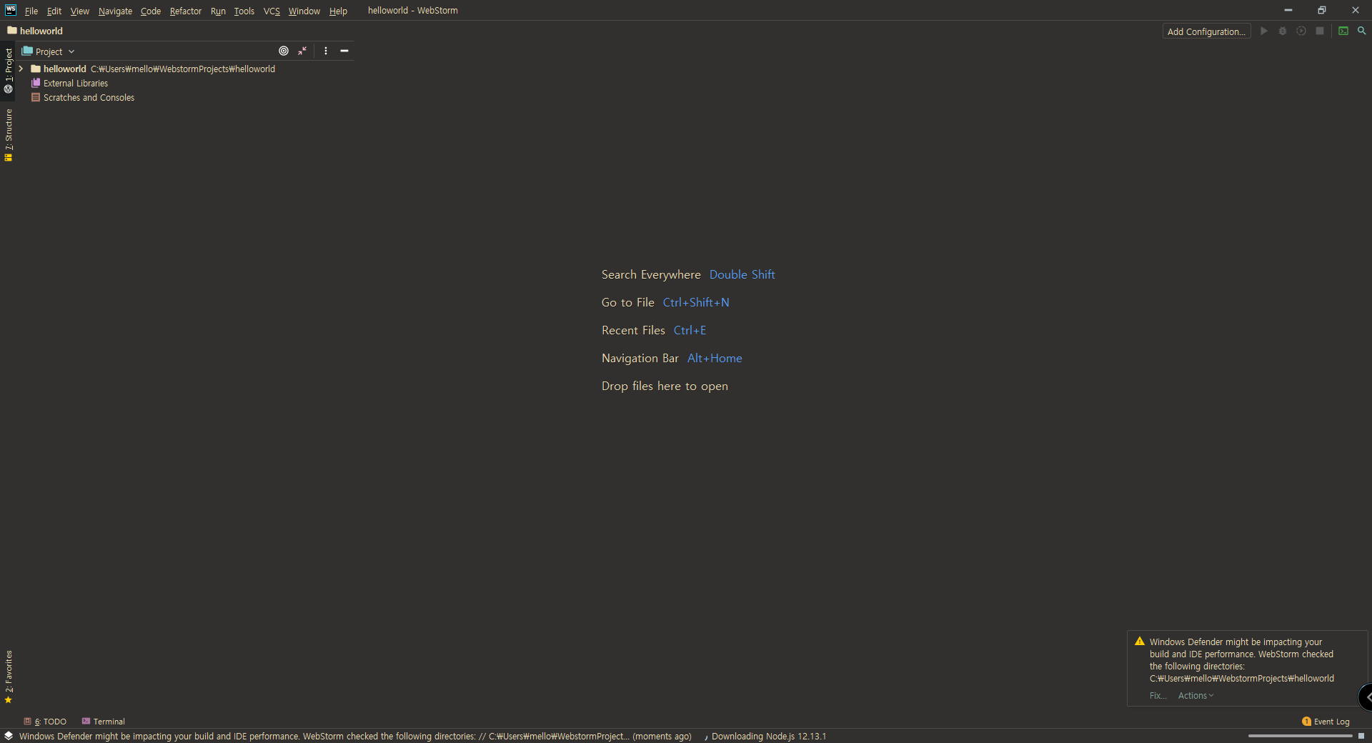 node.js를 설치하지 않았다고 하더라도 WebStorm에서 다운로드 받을 수 있게 유도를 하기 때문에 node.js를