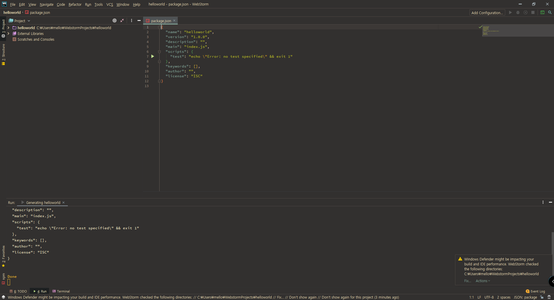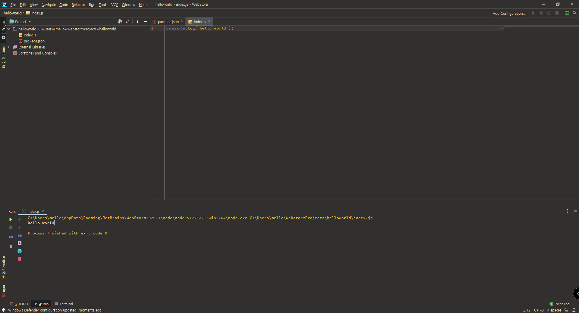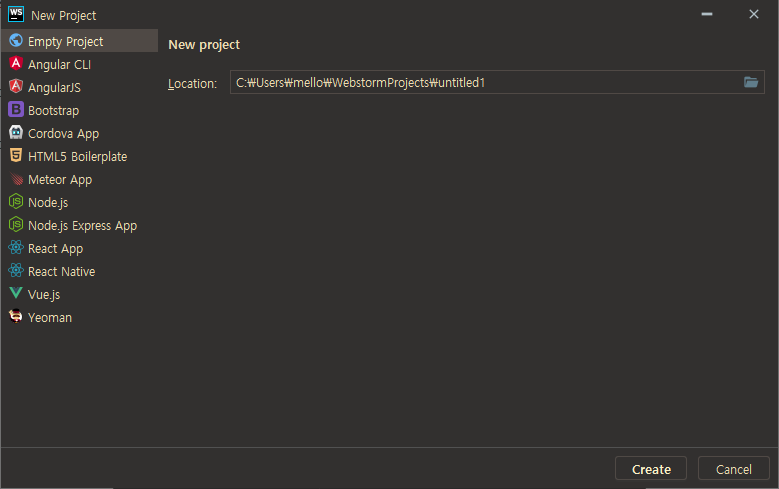 WebStorm을 설치했으면 이제 node.js 프로젝트를 생성하고 hello world까지 출력해보기로 하자.