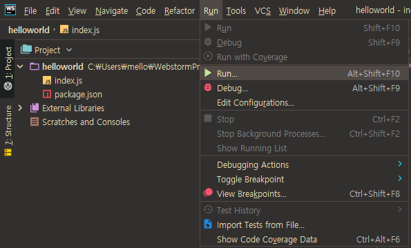[node.js] WebStorm으로 프로젝트 생성부터 hello world 출력까지