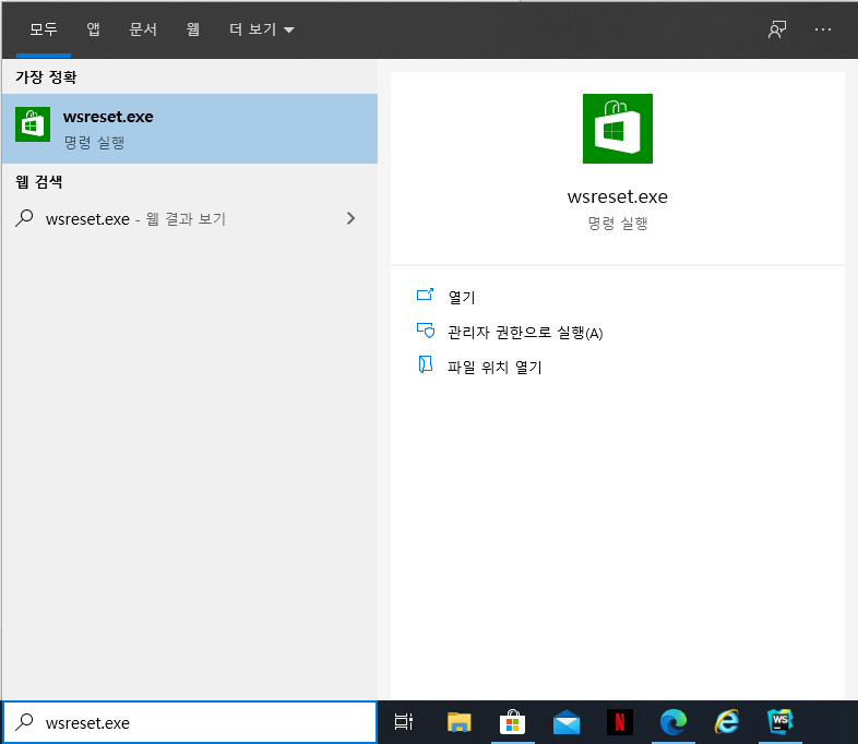 윈도우키를 누르고 wsreset.exe를 입력하면 위와 같은 프로그램이 검색 된다.