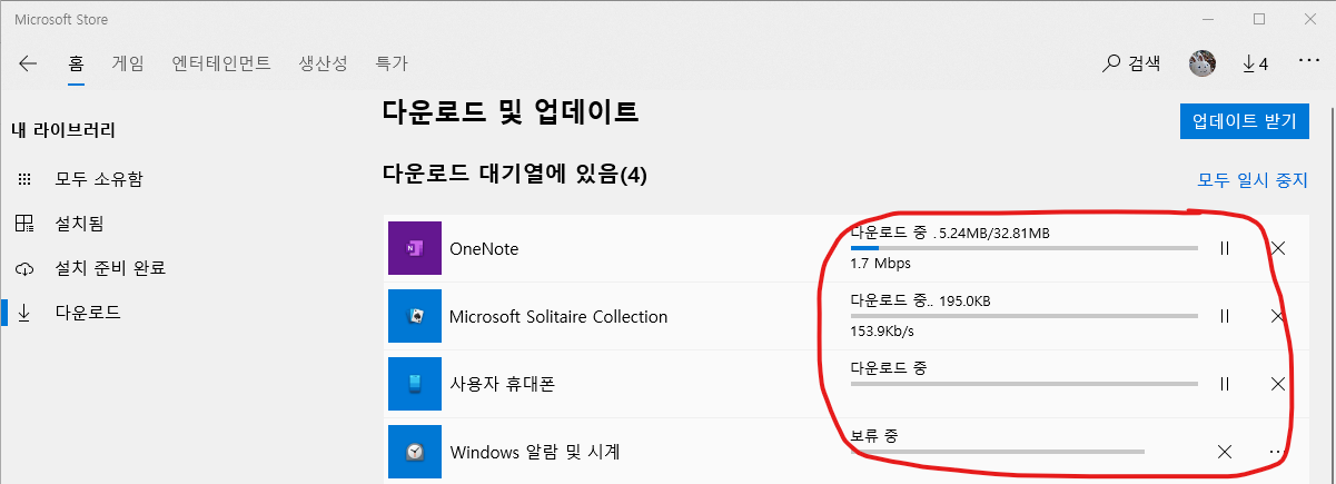 마이크로소프트 스토어에서 업데이트 받기 버튼을 누르면 설치된 앱들의 업데이트가 진행된다.