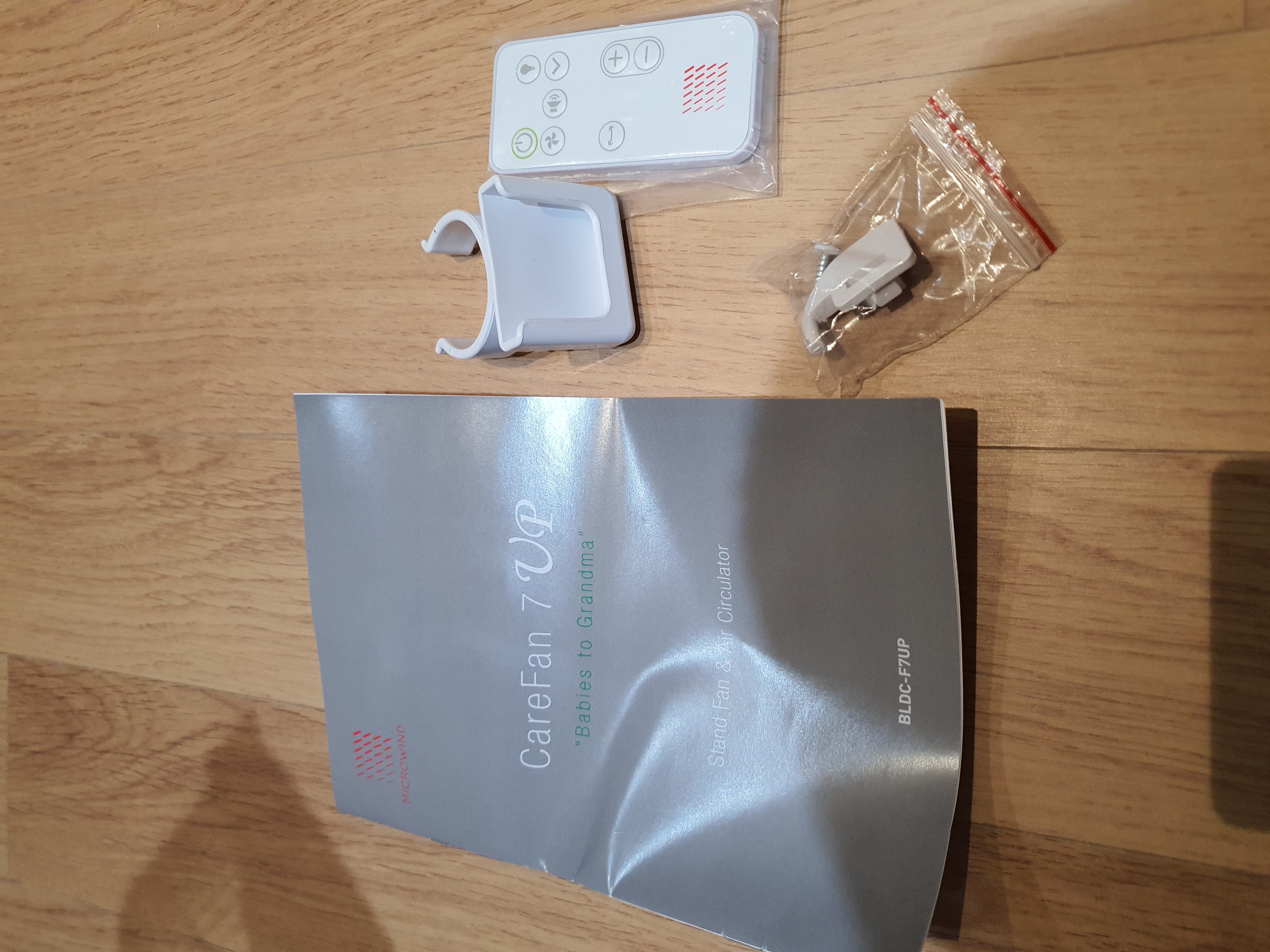 리모컨과 리모컨 고정대, 또 선풍기 머리를 고정하기 위한 잠금장치와 나사가 있다.