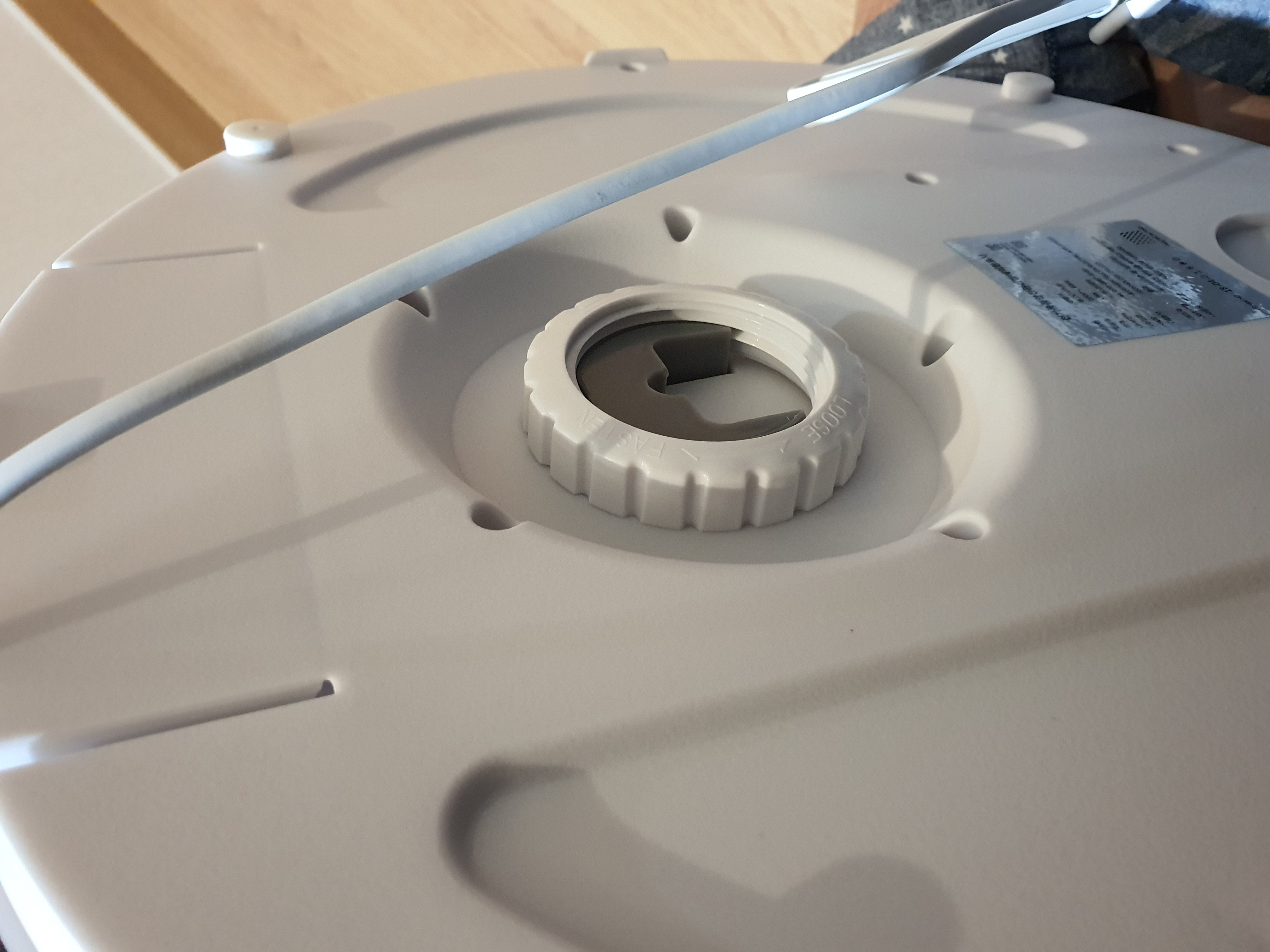 선풍기 받침에 기둥을 고정하기 위해 기둥 아래에 있는 흰색 원형 고정 뚜껑을 왼쪽으로 돌려 분리시킨다.