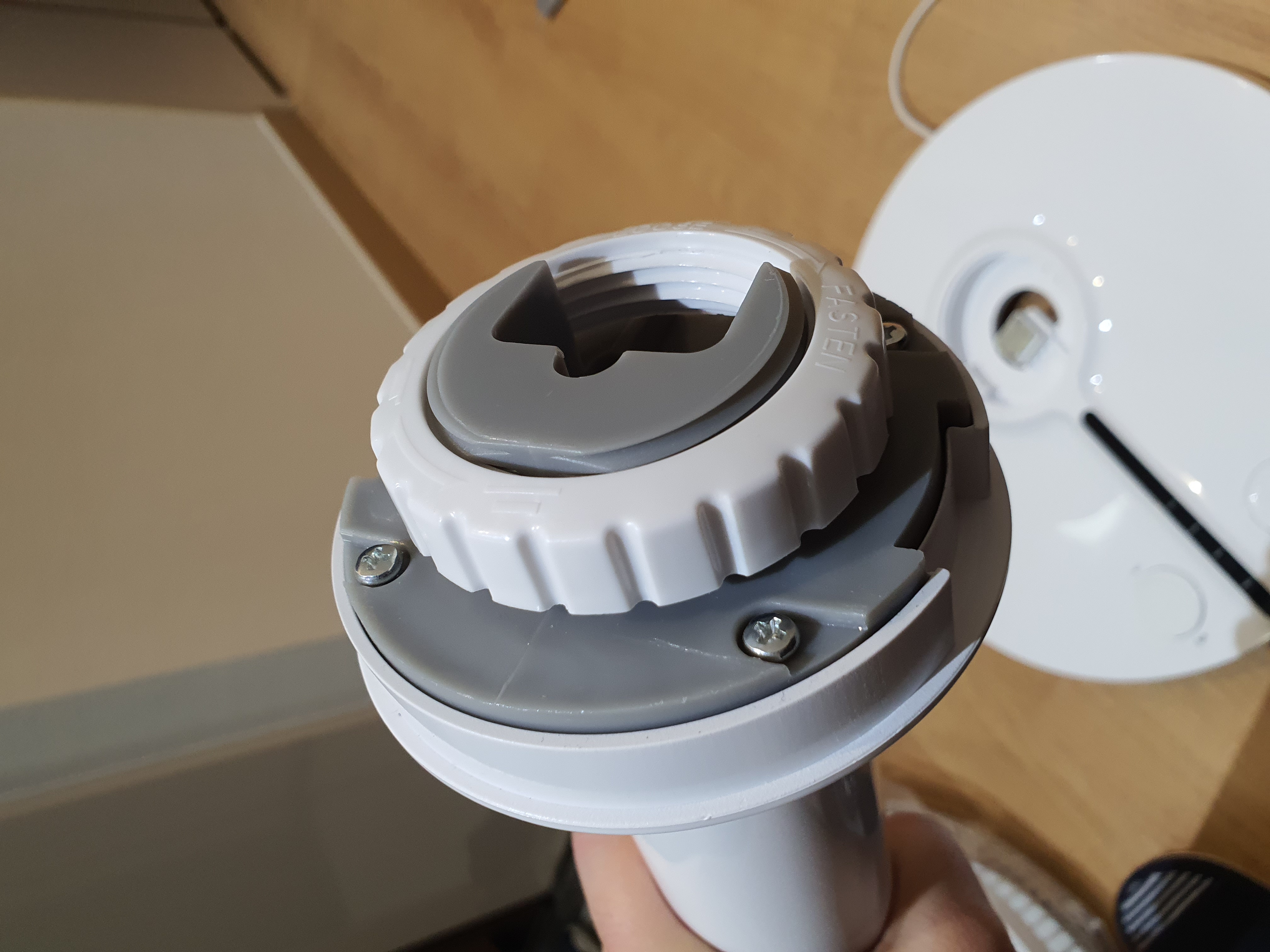 그리고 기둥을 받침대에 끼운 다음 아까 분리했던 고정 뚜껑을 오른쪽으로 돌려 고정시킨다.