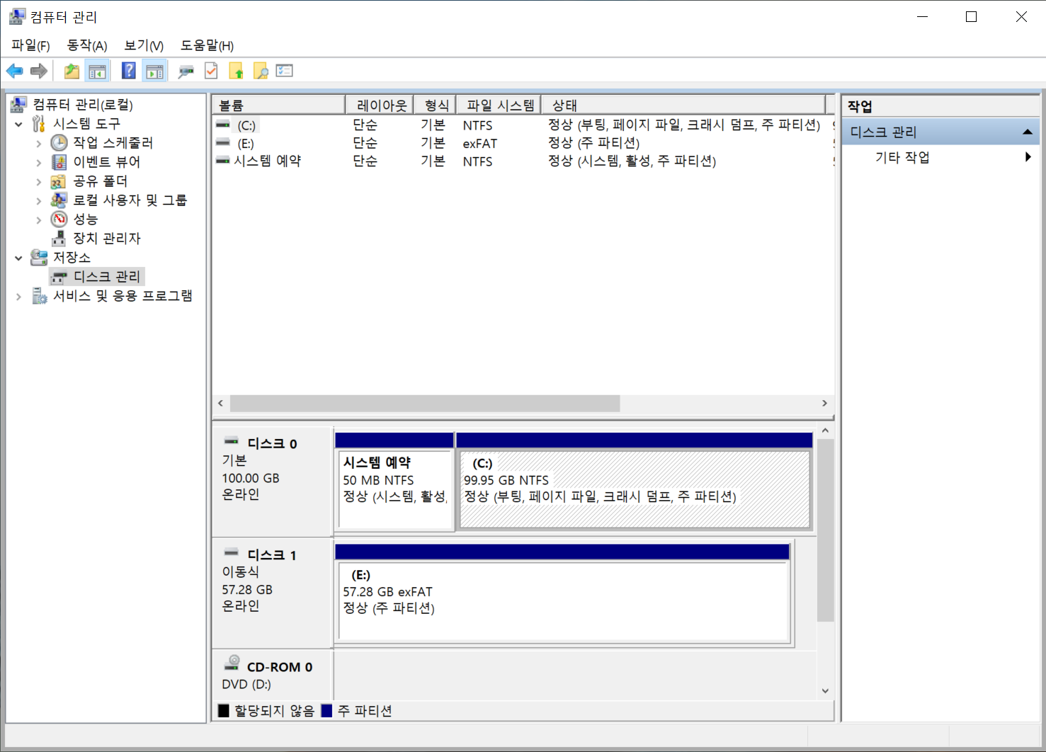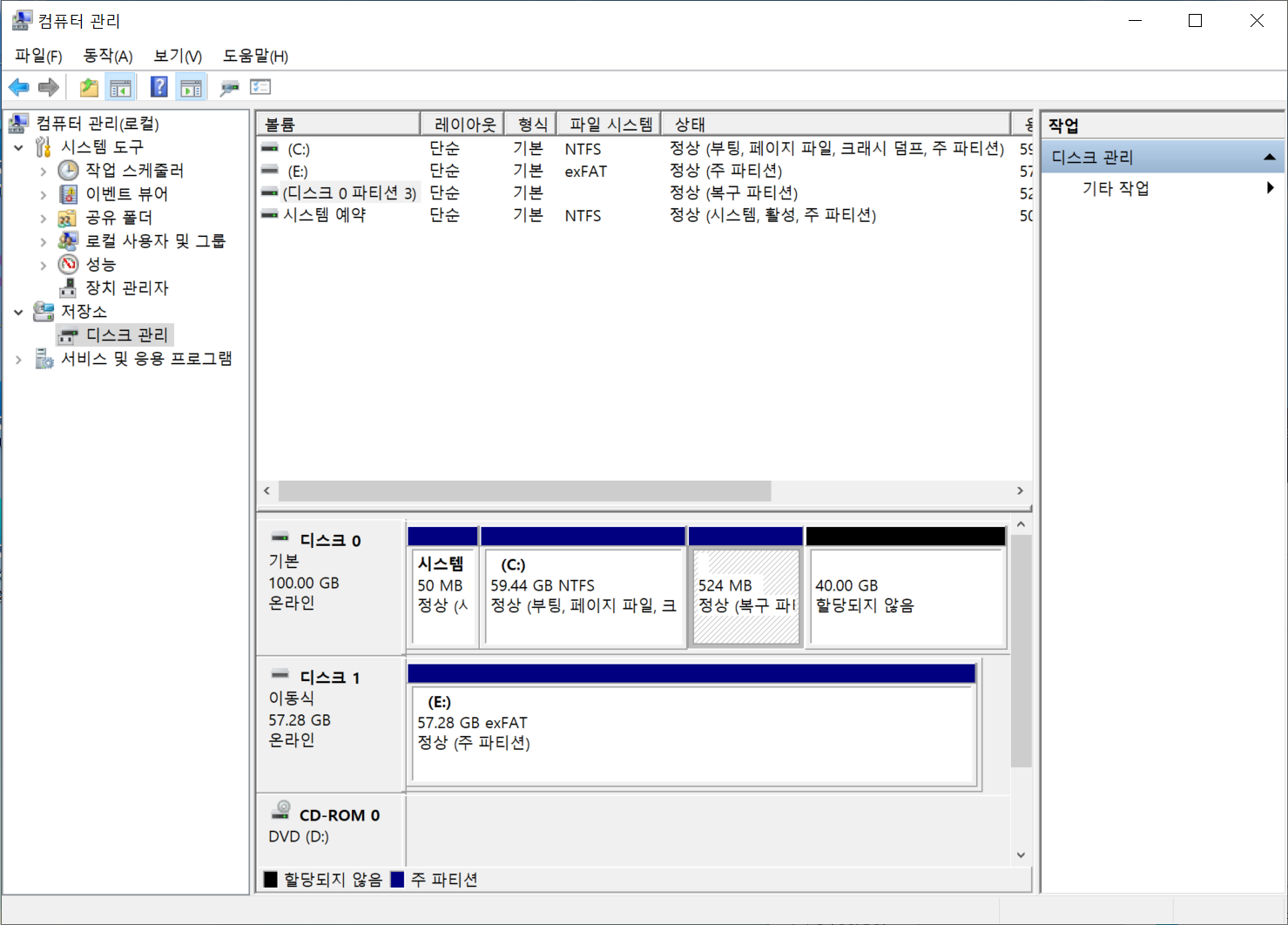 이제 디스크 관리에서도 복구 파티션이 보이지 않는다.