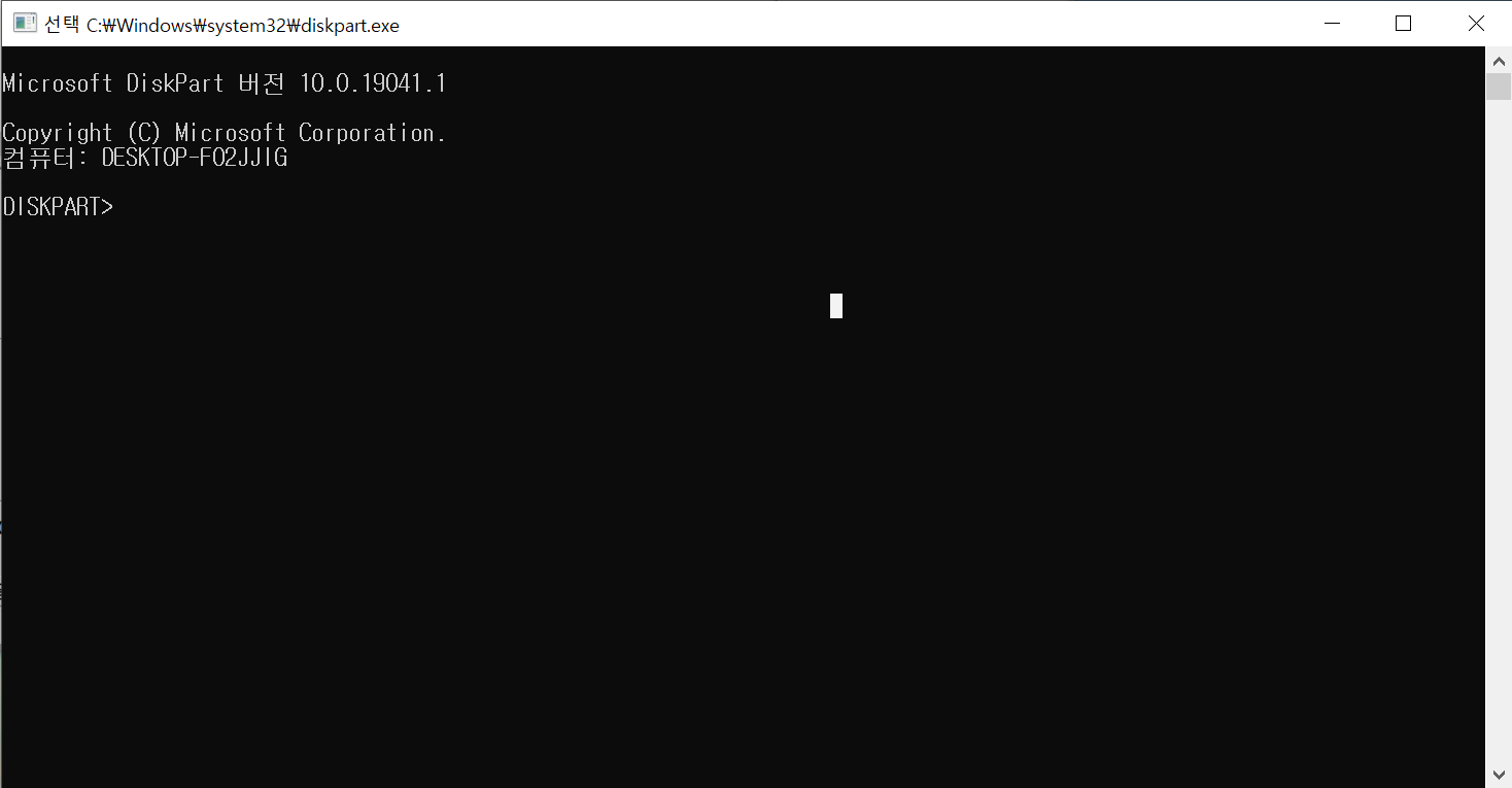 diskpart를 실행하면 새로운 창이 뜨면서 DISKPART>가 출력된다.
