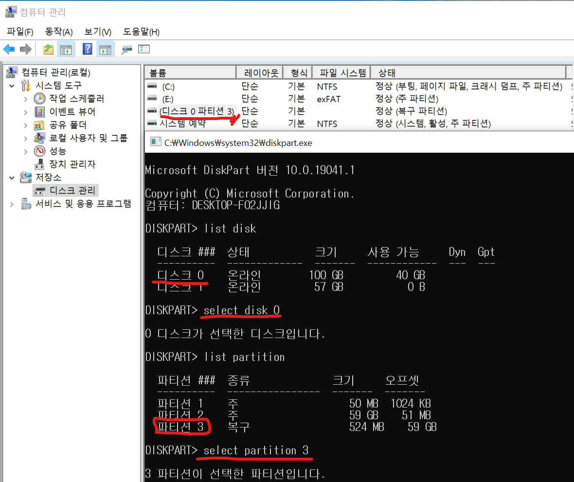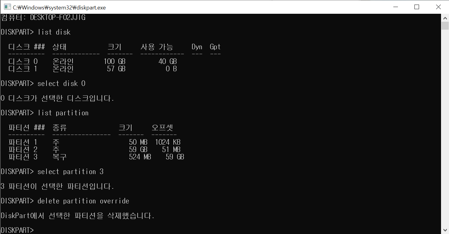 복구 파티션을 삭제하려면 DISKPART에서 해당 파티션을 선택해야 한다.
