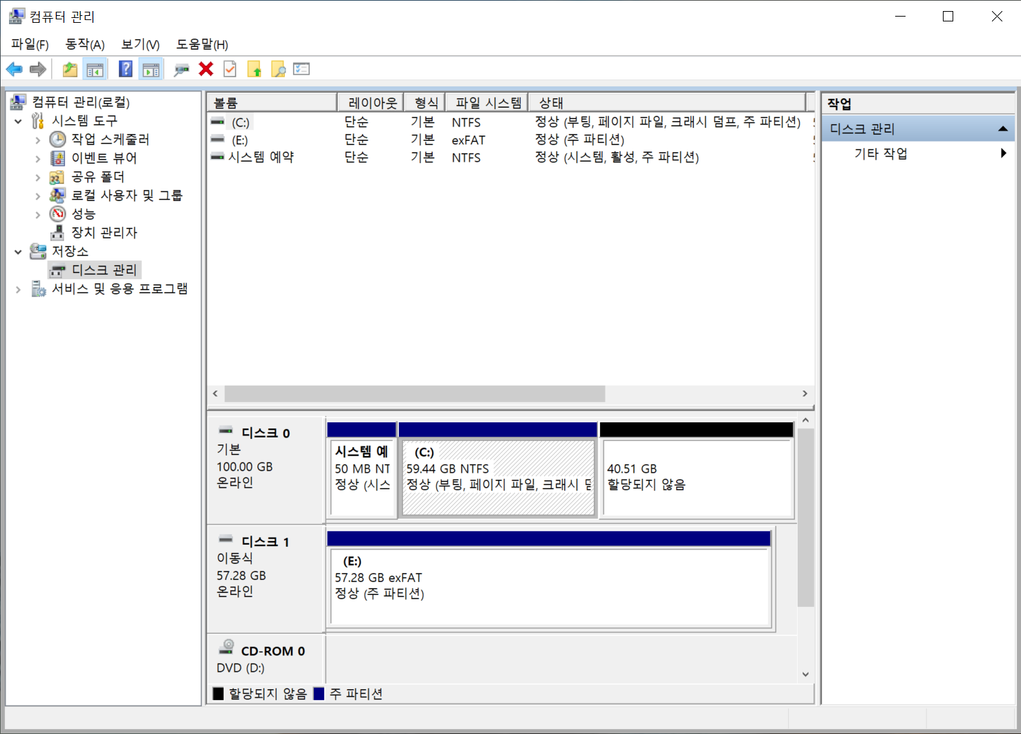 파티션 확장을 하려고 디스크 관리를 가보니 복구 파티션이 중간에 껴있어 확장을 할 수 없었다.