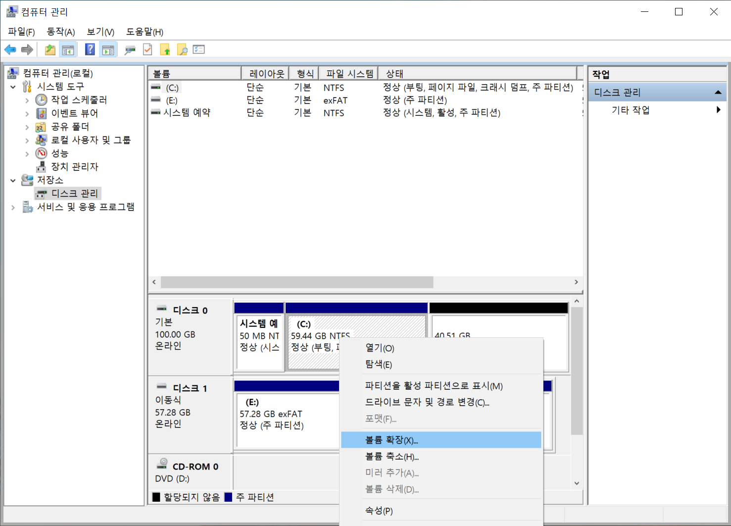 C:에서 우클릭 하면 볼륨 확장 메뉴가 활성화 된 것을 볼 수 있다.