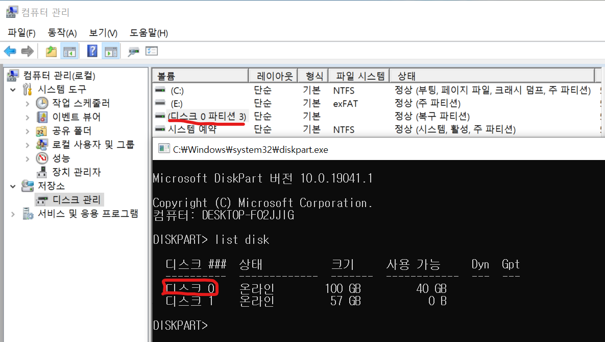 디스크 관리에서 복구 파티션의 볼륨 이름(디스크 0 파티션 3)을 확인하자.