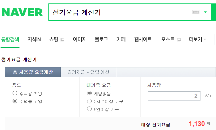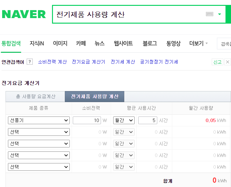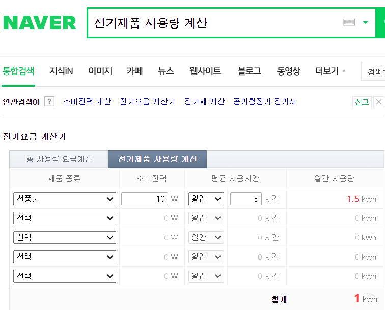 네이버에서 전기제품 사용량 계산을 치면 계산기가 바로 나온다.